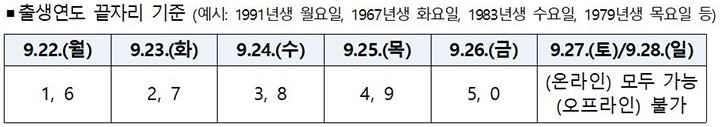 * 첫 주(9/22 ~ 9/26)에는 출생 연도 끝자리 기준 요일제를 적용하여 온라인 신청 편의를           조정함(오프라인 신청은 지역별로 요일제 적용 여부가 다를 수 있음)